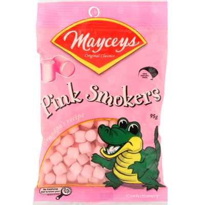 Indulge in the classic and unique flavor of Mayceys Pink Smokers. This 95g bag is packed with smoky-flavored, hard candies that have delighted generations of Kiwis since the 1930s. Each candy offers a distinctive taste experience, combining a sweet base with a subtle smoky flavor that is truly one-of-a-kind.